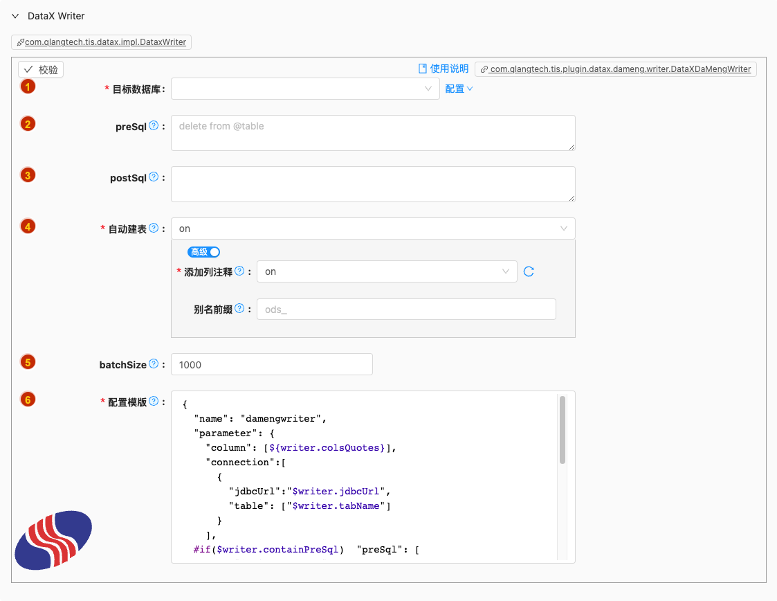 - 默认值: com.qlangtech.tis.plugin.datax.dameng.writer.DataXDaMengWriter.getDftTemplate()