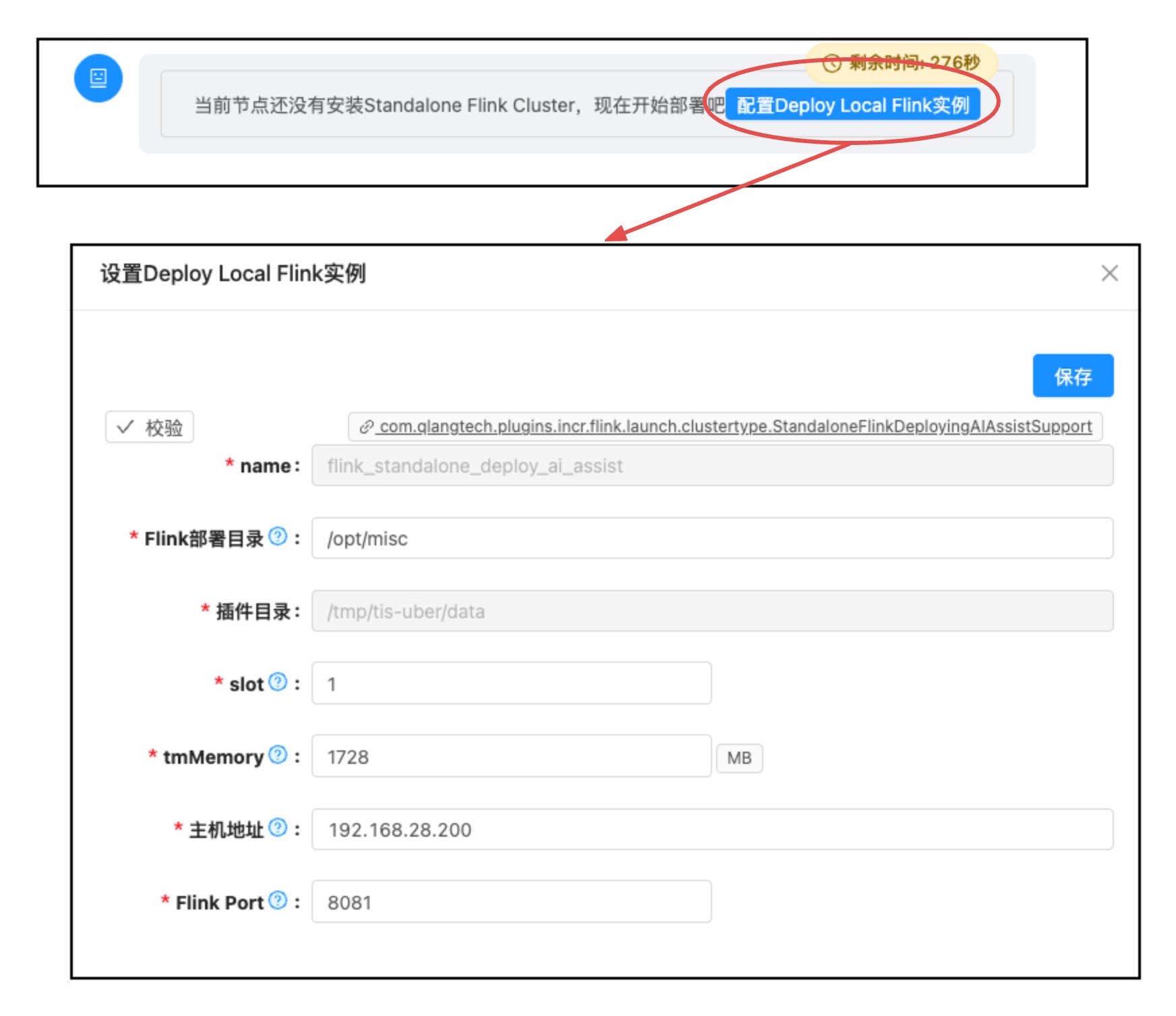 插件配置补全对话框 - 显示已自动填充的字段和需要用户补充的字段,以及倒计时