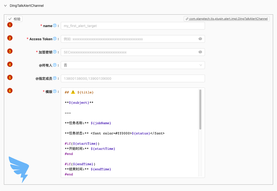 - 默认值: com.qlangtech.tis.plugin.alert.impl.DingTalkAlertChannel.loadDefaultTpl()