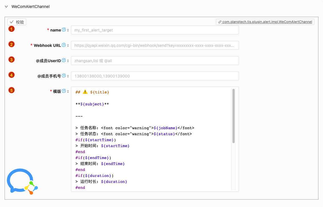 - 默认值: com.qlangtech.tis.plugin.alert.impl.WeComAlertChannel.loadDefaultTpl()