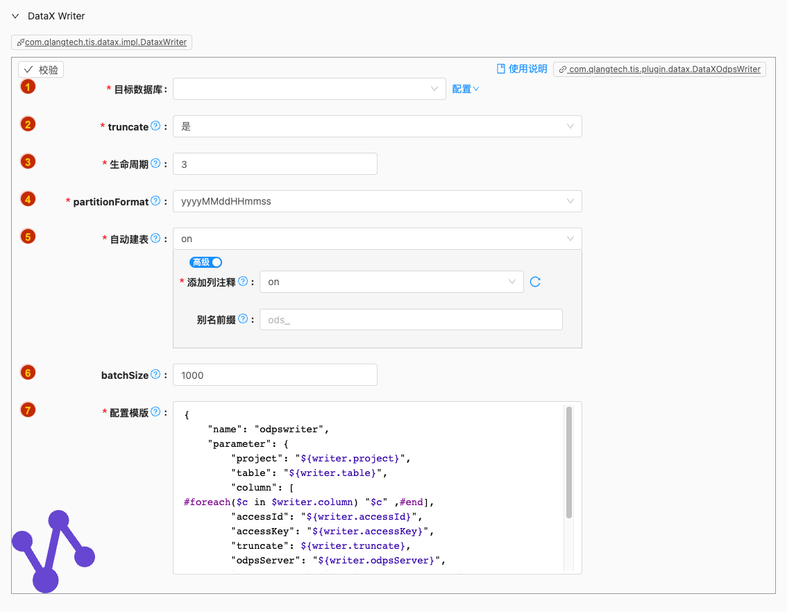 - 默认值: com.qlangtech.tis.plugin.datax.DataXOdpsWriter.getDftTemplate()