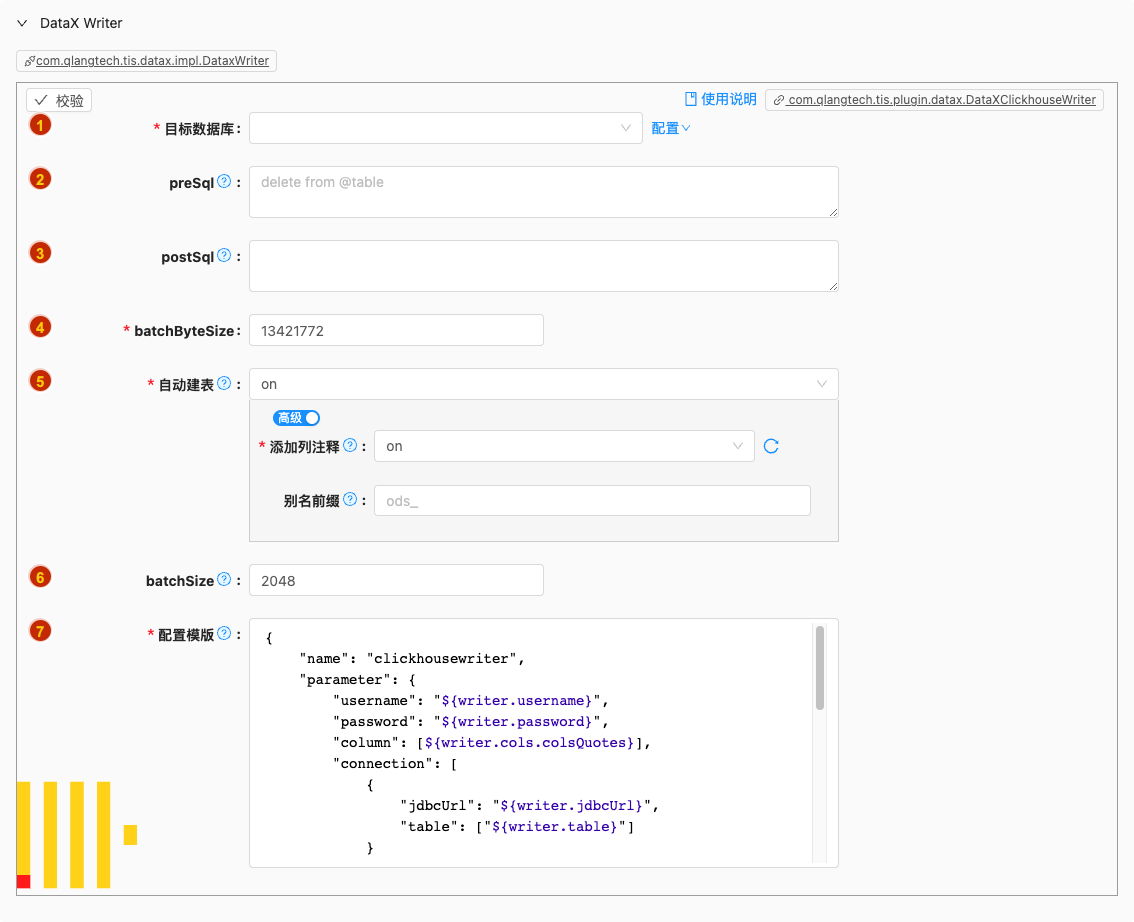 - 默认值: com.qlangtech.tis.plugin.datax.DataXClickhouseWriter.getDftTemplate()