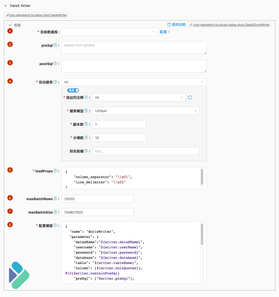 - 默认值: com.qlangtech.tis.plugin.datax.doris.DataXDorisWriter.getDftTemplate()