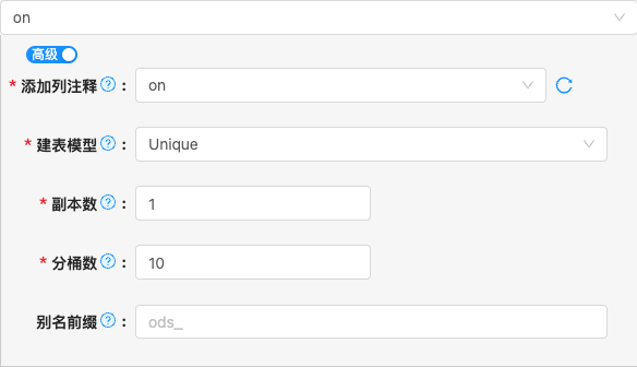Off,如需要生成可以选择Unique和Duplicate之一,如需要使用Aggregate模型,由于Agg模型需要设置非聚合列的聚合函数,系统无法预知。 可先选择Unique和Duplicate任意一种,待到DDL生成之后,手动在DDL之上进行修改。Doris 支持三种数据模型:
