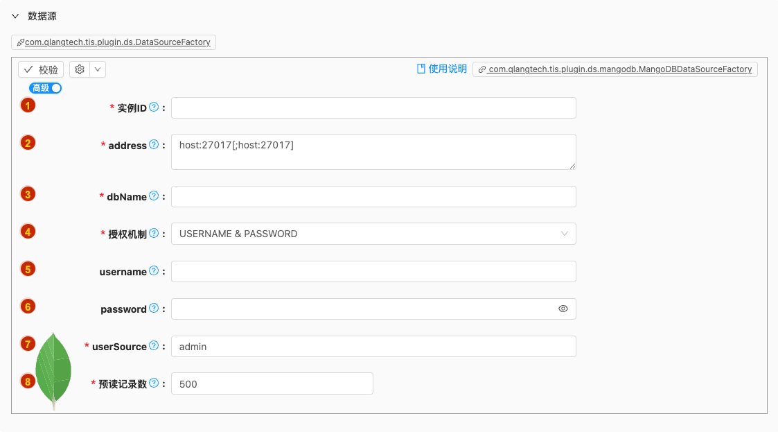 - 说明: MongoDB的数据地址信息,因为MonogDB可能是个集群,则ip端口信息需要以Json数组的形式给出,可填写多个每个address中间可用';'分隔【必填】
