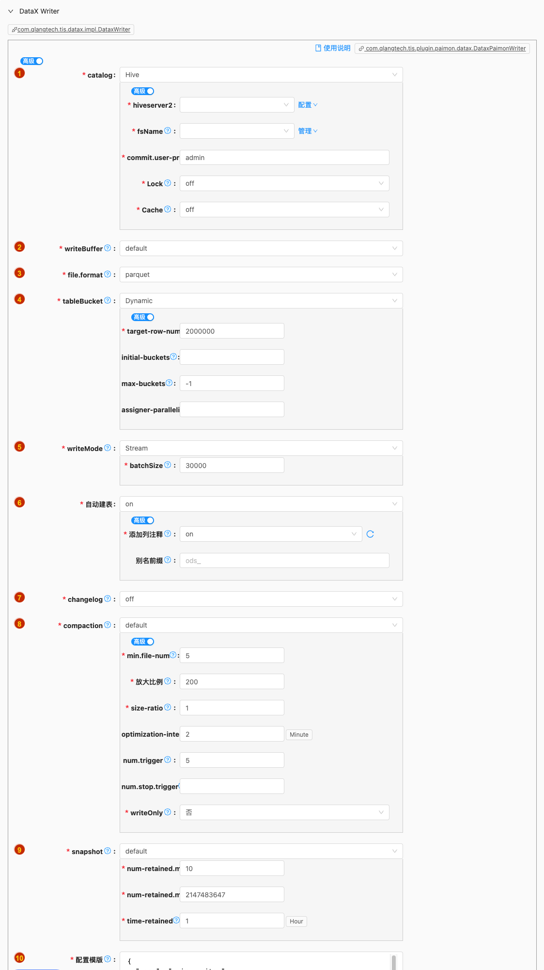 - 默认值: com.qlangtech.tis.plugin.paimon.datax.DataxPaimonWriter.getDftTemplate()