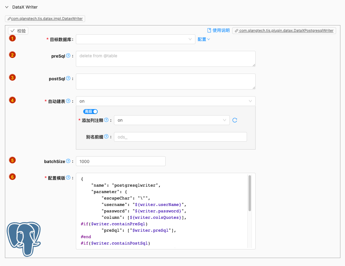 - 默认值: com.qlangtech.tis.plugin.datax.DataXPostgresqlWriter.getDftTemplate()